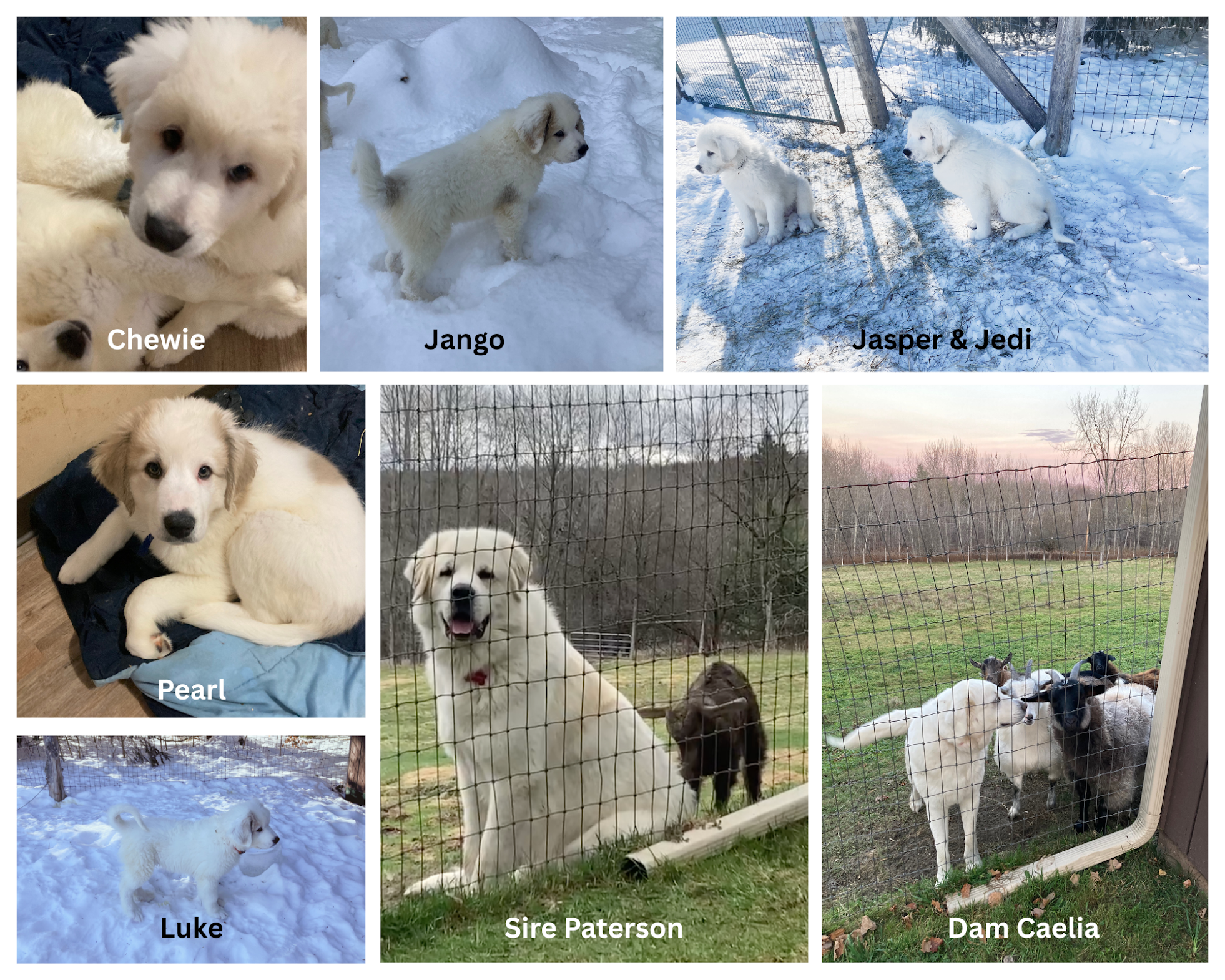 Posted Feb 14, 2026- VERMONT Amber Roots Farm located near Glover, Vermont, welcomed our first litter of twelve CMD puppies on November 25, 2025 (Litter #ARF025LIT1G3). The G2 sire is GHH Paterson (GHH022M0001G2). He is an excellent guardian of our kid goats and skilled with detection of aerial predators. We run an Airbnb and he is very popular with adult and child guests alike. He is very playful, adores people, begs for pats, and regularly garners praise in post-stay reviews. He also passed his hip check. The dam is G3 ABF Caelia (ABF023F0002G3), a very serious guardian of people and animals of all kinds. She was guarding our chickens almost as soon as she arrived as a pup, and though we have coyotes, bobcats, fisher, bears, minks, raccoons, eagles and other predators on the property and nearby, we have yet to lose a single chicken to a predator. She is also very friendly with people, is brave in all situations, a rock solid and unflappable protector, and an excellent mother. The pups are all friendly and welcoming to human visitors and all have mellow personalities. We have 1 female and 5 males available. All have passed their first veterinary health check and are up-to-date on deworming and vaccinations. They are all being exposed to goats, chickens, and small equines and love being outside in the snow.
